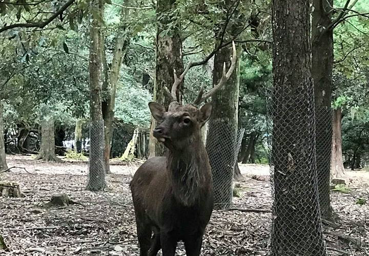 個展を開催している三条通りはJR奈良駅から春日大社へつながる古い参道です。春日大社の大きな鳥居をくぐると鹿の姿を見るようになります。参道の奥へ行くほど鹿がどんどん現れて、春日の森は映画の世界のように美しく縄文時代へと一気に迷い込んだ気になります。